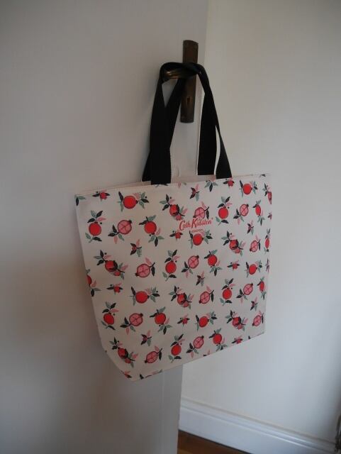 アイボリー地にざくろ柄デザインで、持ち手が、黒です。