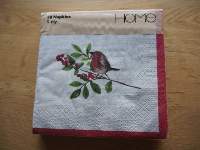 生成り地に真ん中にはロビン(コマドリ)と柊が描かれていて、縁が赤いデザインです。
